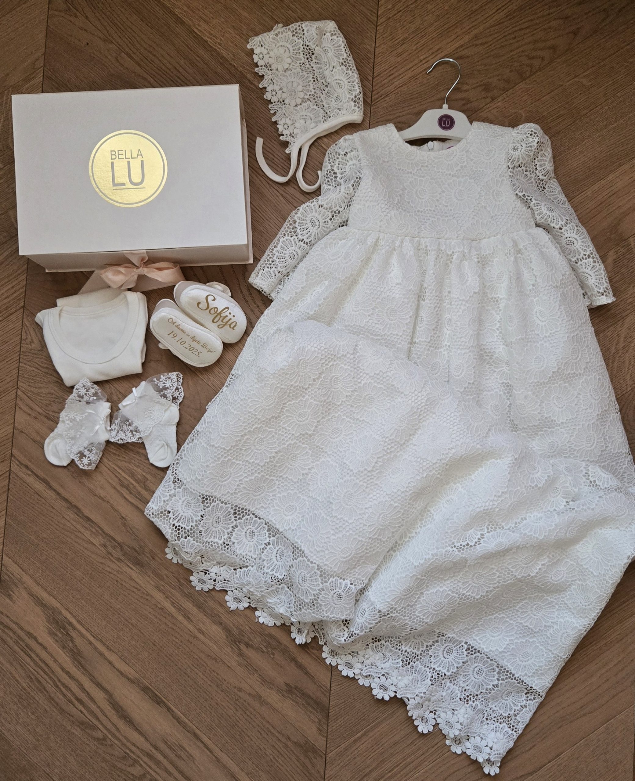 Svaki komad ovog kompletića pažljivo je oblikovan kako bi pružio udobnost i sofisticiranost za vašu malu princezu. Oplemenjeni delikatnim detaljima, ovi elegantni komadi zajedno stvaraju izgled prikladan za važne trenutke poput krštenja ili drugih svečanih događanja.