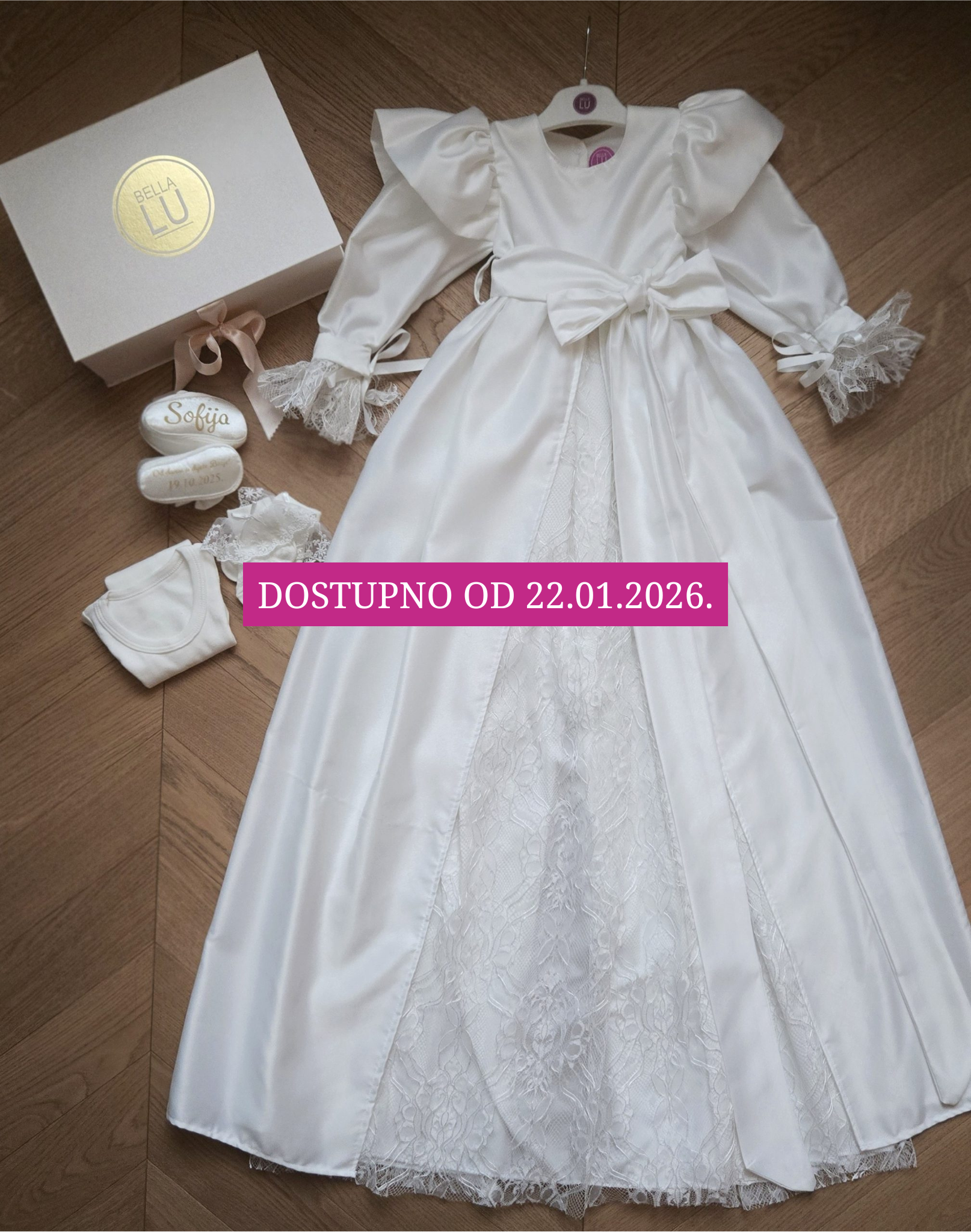 Komplet sadrži haljinjicu, trakicu, cipelice, body (dugih/bez rukava) i čarapice/štramplice.