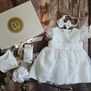 Svaki komad ovog kompletića pažljivo je oblikovan kako bi pružio udobnost i sofisticiranost za vašu malu princezu. Oplemenjeni delikatnim detaljima, ovi elegantni komadi zajedno stvaraju izgled prikladan za važne trenutke poput krštenja ili drugih svečanih događanja.