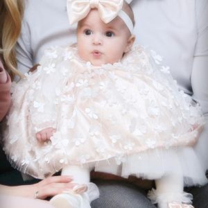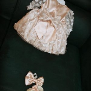 Svaki komad ovog kompletića pažljivo je oblikovan kako bi pružio udobnost i sofisticiranost za vašu malu princezu. Oplemenjeni delikatnim detaljima, ovi elegantni komadi zajedno stvaraju izgled prikladan za važne trenutke poput krštenja ili drugih svečanih događanja.