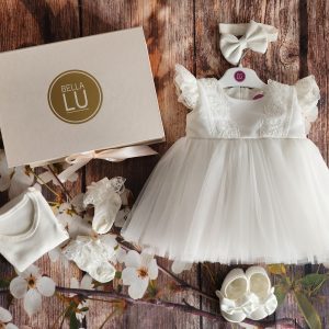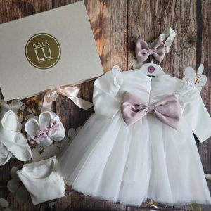 Svaki komad ovog kompletića pažljivo je oblikovan kako bi pružio udobnost i sofisticiranost za vašu malu princezu. Oplemenjeni delikatnim detaljima, ovi elegantni komadi zajedno stvaraju izgled prikladan za važne trenutke poput krštenja ili drugih svečanih događanja.