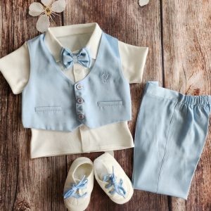 Komplet sadrži nježnu košuljicu, elegantan prsluk, leptir mašnu i kravatu, te udobne hlače i posebne cipelice za nehodače.